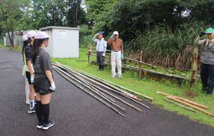 地域の方々のお力をお借りして、古くなった観察池の柵の補修を行いました。木の杭を打ち込み、ひもで竹を固定しました。どうやったら緩まずに固定できるのか自分たちで考えながら取り組みました。なかなか上手くいかず、竹を固定する方法を地域の方に助言をいただきながらなんとか形にすることができました。竹の加工や、杭の準備まで、本当に地域の方々にお世話になりました。大畑っ子のために考え、準備し、動いてくださり感謝しております。6年生も、地域の方々に見守られながら、よい学びができました。