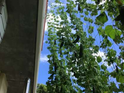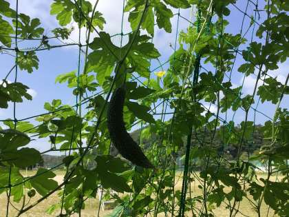 4年生の総合的な学習で、ツルレイシを育て、緑のカーテンを作っています。夏季休業前に4年生が苗を植え、その後も水をやったり、肥料をやったりして丹念に育ててきたツルレイシが随分成長しました。環境に配慮した取組で、日陰ができて涼しいだけでなく、見た目にもとてもさわやかです。