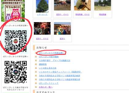 「ばたっぴぃ」から残暑見舞い動画が届いています。トップページの左下にQRコードがあるので、それを読み込むか、トップページの「お知らせ」一番上の「ばたっぴぃからの残暑見舞い」をクリックしてください。