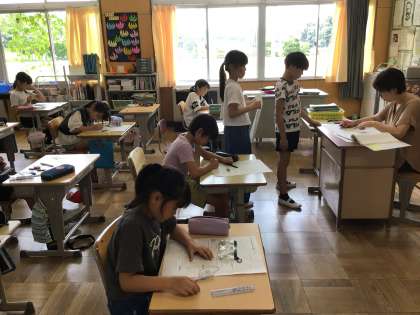 4年生は、夏休みまでの振り返りプリントで学習しました。間違えた漢字を何度も書き直しするなど、確実に身に付けようと取り組んでいました。