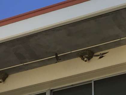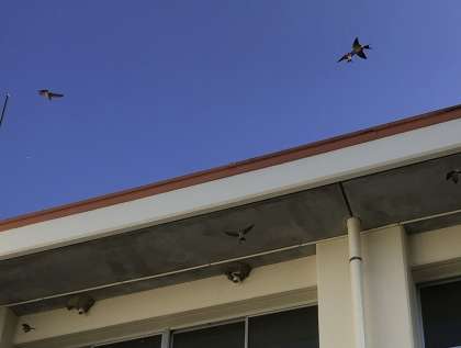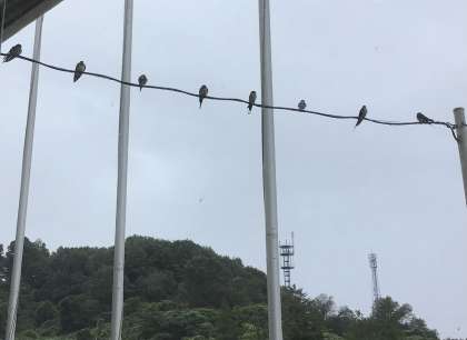 今朝、運動場に出てみると、たくさんのコシアカツバメが飛び回っていました。よく見ると体の大きさが、大小様々でした。今年生まれたひなたちが、親鳥と飛び立つ練習をしているつようでした。3枚目の写真は、台風10号が来る直前の8月29日(木)に撮りました。みんなで仲良く休憩しているようでした。