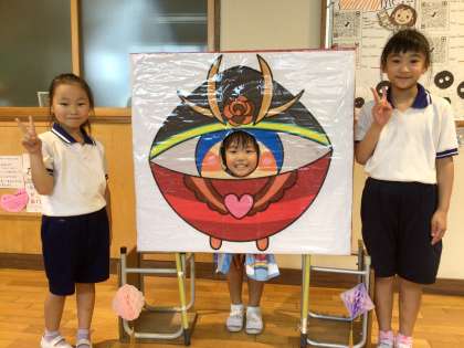 休み時間に、学校マスコットキャラクター「ばたっぴぃ」の顔はめパネルを楽しんでいる大畑っ子がいました。順番を守って、一人ずつ「ばたっぴぃ」になり切る大畑っ子の姿がとてもほほえましいです。