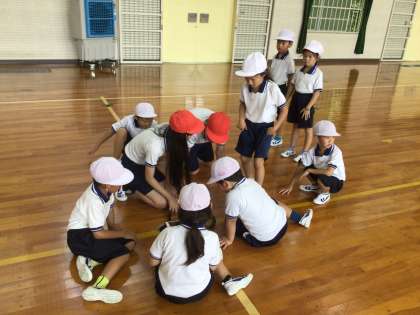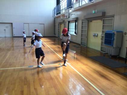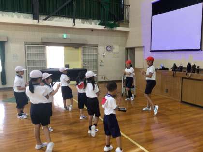 体育科で1、2年生は、6年生に「リズムジャンプ体操」を教えてもらいました。なかよし班のグループに分かれて練習をし、班ごとに動画を見たり、一緒に踊ったりしました。最後の振り返りでは、「6年生に教えてもらえて嬉しかった!」と感想を言う1、2年生がたくさんいました。