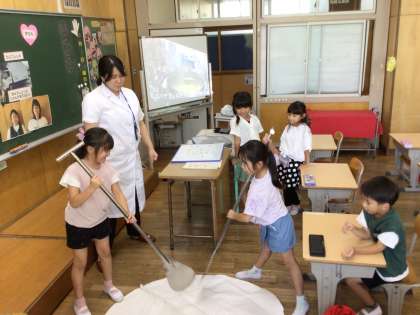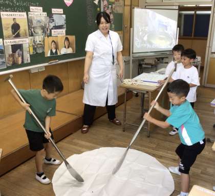 給食センターで働いている栄養教諭を講師にお招きして、食育の授業を行いました。大畑小学校に給食を届けるために、農家の皆さん、給食センターの調理員さん、栄養教諭、運搬する人、配膳員さんなど多くの人々が尽力しています。給食の献立を考えている栄養教諭が、動画を用いながら、1年生の子どもたちに、給食について説明をしました。給食を作るために使われている大きなスパテラを実際に触ることもでき、子どもたちは、大興奮でした。多くの方々のおかげで栄養満点の美味しい給食を食べられることが分かり、さらに食が進みそうです。