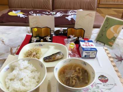 今日の献立は、「ごはん、牛乳、いわしの梅煮、とり肉とキャベツのおひたし、のっぺい汁、月見だんご」の月見献立でした。
