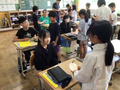 昨日、6年生の修学旅行の安全と成功を願って、5年生が作った「うちわ型メッセージカード」と「大きなばたっぴぃ目印」を6年生に渡しました。メッセージの中には、「修学旅行で『最幸』の思い出を作ってきてください!」と成功を願う言葉や、「6年生のいない間、最高学年として頑張ります!」といった決意の言葉が見られました。