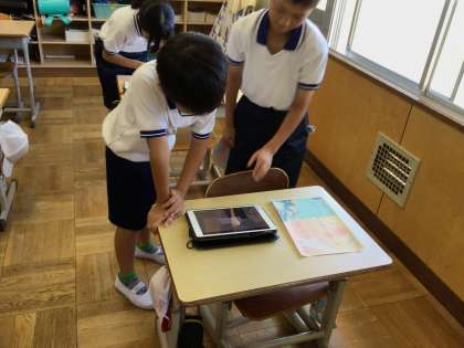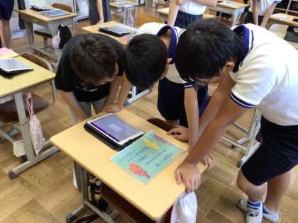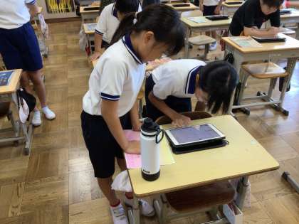 5年生は国語科で、それぞれ心が動いた場面を思い浮かべながら、短歌を作成しました。短歌を作成した後は、ICT機器を活用して、音声をOneNoteに入れたり、掲示物を作成したりしました。単元の終わりにはそれぞれの短歌を読み合い、心の動きを感じながら作品のいいところを伝え合いました。