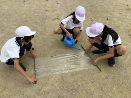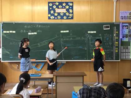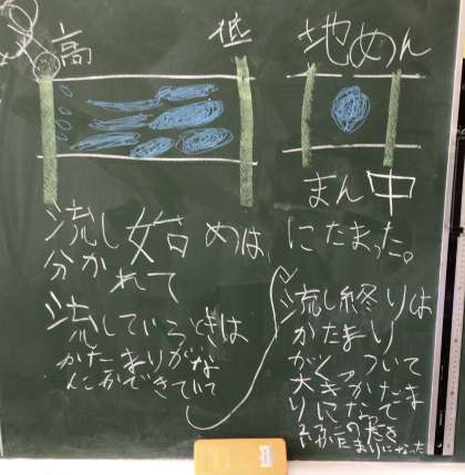 理科の学習で、雨水はどこへ流れていくのか考えました。「高いところから低いところへ流れていく」「くぼんだところにたまる」と予想して実際に運動場で水の流れていく様子を観察しました。動画に撮ったりイラストに書いたりして実験結果を発表しました。