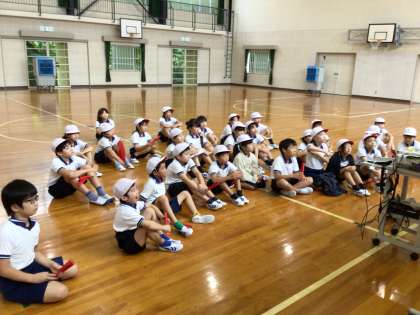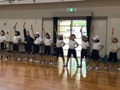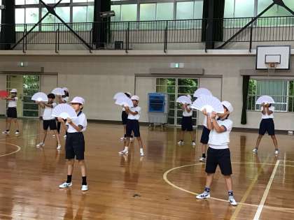 踊りの練習が順調にすすんでいます。チーム練習では、互いに声をかけあってまとまって踊っています。全体練習では、隊形移動の練習が始まりました。教師の話を一生懸命聞いてがんばっています。来週からは、安全に留意して運動場で練習する予定です。