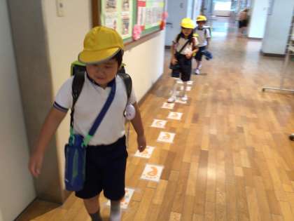 「さんぽ」の歌を口ずさみながら、足跡に合わせて、ゆっくり歩く子の姿がみられます。