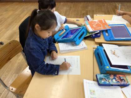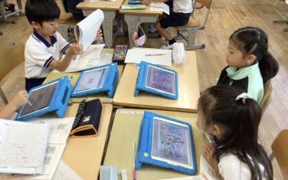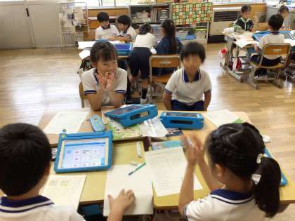 2年生 国語科 お話の創作 公開日 2024/10/09 更新日 2024/10/09 各学年から 2年生は国語科「絵を見てお話を書こう」の単元で、お話を作り、グループ内で発表し合いました。描いた絵は、学習用タブレットの発表ノートで共有し、絵を見ながらお話を聞きました。独創的なお話もあり、楽しく聞くことができました。