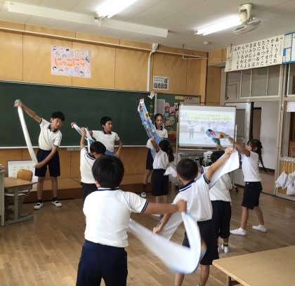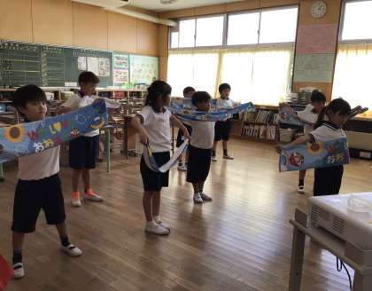 なかよしタイムに、ばたっぴぃストレッチの練習をしました。1年生は、1年生教室と6年生教室に分かれて行いました。大畑フェスティバル実行委員制作の「ばたっぴぃストレッチ動画」を見ながら、みんなで練習しました。背中をピンと伸ばしたり、体を傾けて筋を伸ばしたりしました。6年生がばたっぴぃストレッチのこつを上手に教えてくれたおかげで、1年生もずいぶん上達しました。