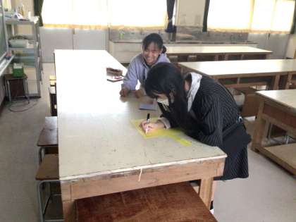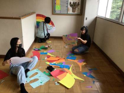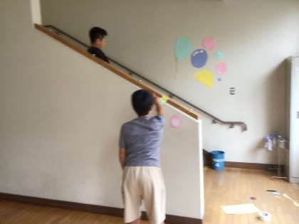 校舎の中の奥行きを生かして、ある場所からみると楽しい絵が浮かび上がる作品をつくっています。遠近法をうまく使って、低学年の子にも喜んでもらえる掲示物を作成中です。