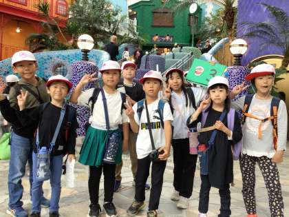 なかよし班ごとに大倉庫を探検しながら、フォトスポットで写真撮影をしています。合言葉は「ばたっぴぃ」です。