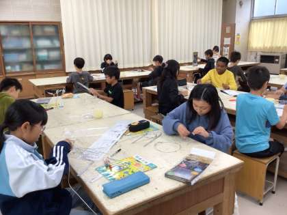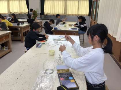 「美しく立つはり金」の学習では、針金の形を変えたり組み合わせたりして、針金が立つように作っています。クラスのみんなで制作途中の作品を見合い、脚の数を多くする、底を丸くするなどと立つための工夫を見つけることができました。11月21日の学校公開日で展示する予定です。