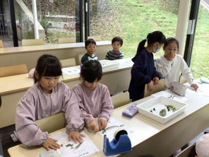 1、2年生 校外学習 その4 公開日 2024/11/05 更新日 2024/11/05 各学年から 散策でスタッフの方に教えていただいた植物をワークシートに貼りました。スタッフの方が、大畑っ子のために、6時間かけて用意してくださった貴重な葉などをセロテープで、丁寧に貼りつけました。学校に戻ったら、学んだことや観察したことを書き込み、ワークシートを完成させる予定です。