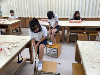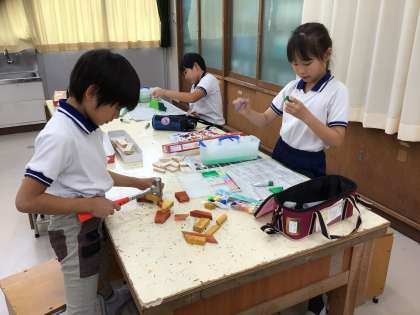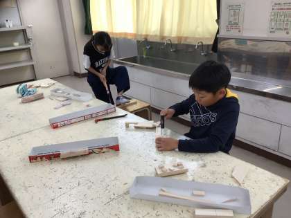 4年生 図画工作科 公開日 2024/11/07 更新日 2024/11/07 各学年から 「ギコギコ トントン クリエイター」の学習では、のこぎりを使って木を切り、くぎで木を組み合わせて作品を作っています。初めてののこぎりに、恐々と活動していた子ども達ですが、次第にコツをつかみ、思った通りに切れるようになりました。出来上がりが楽しみです!