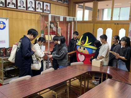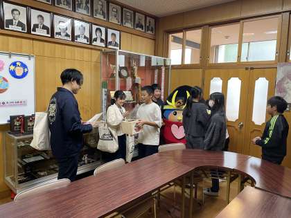 来校の際には、学校マスコットキャラクター「ばたっぴぃ」が登場しました。ばたっぴぃの可愛さを、大変喜んでくださいました。6年生が、「ばたっぴぃ」の紹介をしたり、昨年度、「ばたっぴぃ」でラリージャパンの応援をして市のイベントを盛り上げようと、作成した缶バッチを受け取っていただいたりしました。
