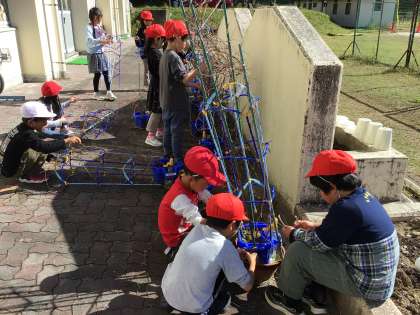 秋といえば……の質問から始まって、「今の時期に植えるとよいものは何だろう」という課題について考えました。子どもたちの中から出てきた「チューリップ」と「ビオラ」を植えることにしました。アサガオを植えていた鉢から支柱を抜き、中の土を畑へ持っていき、準備万端です。自分が終わると、まだできていない友達を助ける子たちがたくさんいました。
