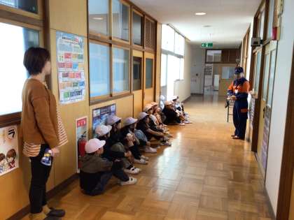 避難訓練の一環として、煙道体験を行いました。消防士の方から、火災では、煙は、上の方が濃いことや煙を吸ってしまうことが命取りになることを教わりました。また、燃えるものによって、煙の色が変わることも知りました。実際に煙道体験をした子どもたちからは、「何も見えなかったから、怖かった」「上の方は全然見えなかったけれど、下の方は見ることができた」と感想が出ました。貴重な経験をすることができました。