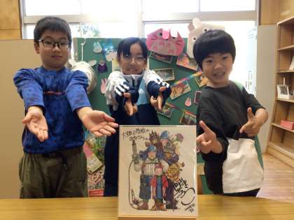 子どもたちは、「大畑小学校へって書いてある!すごい!」「この絵は、あの作品だよね!」「ごろうって、書いてあるよ」「時計台も、ハウルの動く城も遠足のときに見たね」と、直筆サインに大喜びです。高学年は、「前回と違う絵の色紙だね。今回の色紙も素敵だね」「2枚目の色紙だ!やったあ!」と比べながら嬉しそうに見ている子もいました。