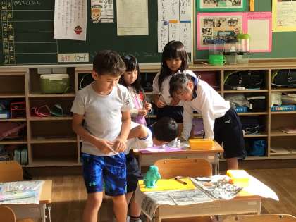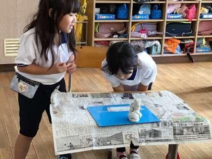 「いっしょにおさんぽ」の単元で、粘土を使って作品作りをしました。一緒に散歩に行きたい仲間を思い浮かべて粘土で表しました。恐竜、うさぎ、犬、魚……と子どもたちの発想はとても豊かで、楽しい作品がたくさん出来上がりました。鑑賞タイムで、友達の作品を細かいところまで観察して、よかったところを発表していました。国語科の「なにに見えるかな」で学習した、思ったことを進んで言ったり、疑問に思ったことを尋ねたりする学びが生きていると感じます。