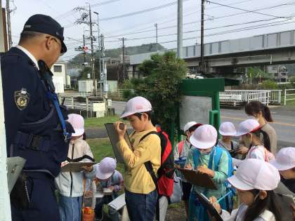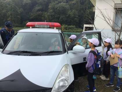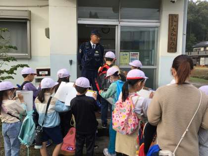 2年生 町探検(秋)その1 公開日 2024/11/15 更新日 2024/11/15 各学年から 2年生は、春に続き2回目の町探検へ出かけました。最初に学校の近くにある大畑駐在所へ行きました。駐在さんに「泥棒はどうやって捕まえますか」「どの様な仕事が多いですか」などいくつかの質問をした後、駐在所の中を見せてもらったり、パトカーの助手席に乗せてもらったりしました。最後に駐在さんから、連れ去り事件に巻き込まれないことや交通安全についてのお話をしていただきました。貴重な体験ができました。