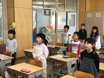 先日の「声楽プログラム」で教えていただいたことを意識して、毎朝、今月の歌「スマイルアゲイン」を歌っています。歌う姿勢にして、口の大きさに気を付けて、歌詞の意味を考えながら……歌詞を読んで、どんなことがあったのか、どんな気持ちだったのだろうかと考えたときには、子どもたちから「友達とけんかしたのかも」「悲しい気持ちだと思う」などという意見が出ました。