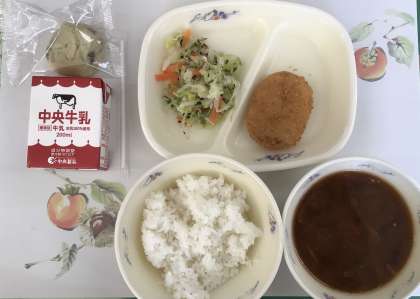 昨日の献立は、「ごはん、牛乳、豊田市産じゃがいもコロッケ、青菜あえ、とよたひまわりポークの赤だし、おにまんじゅう」でした。