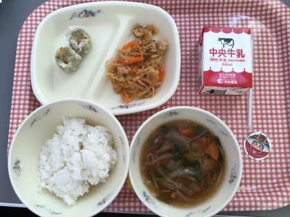 昨日の献立は、「キムチチャーハン、牛乳、野菜入りしゅうまい、五目スープ」でした。