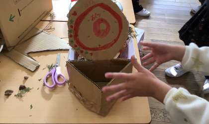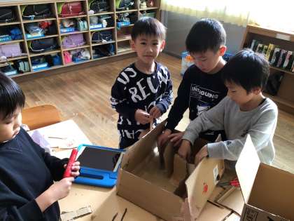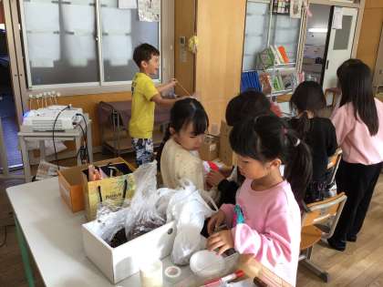 秋見つけで見つけた宝物を使って、おもちゃ作りをしています。それぞれのチームに分かれて、ああでもない、こうでもないと相談しながら、協力し合って作成しています。今週の金曜日にみんなで遊ぶのを楽しみに準備を進めていきます。