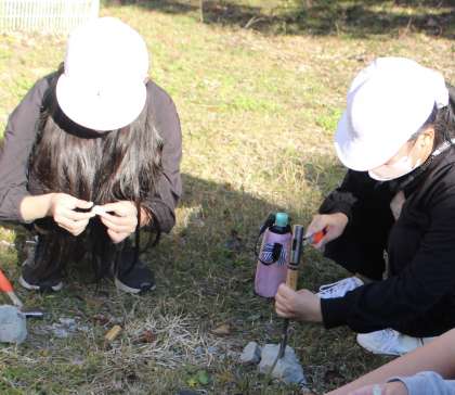 地層から何万年前の様子がわかることを学習しました。そこで、保見地区の近くにある田籾町からとれる岩石を準備し、化石の発掘をしました。友達と一緒に渦巻き模様の貝や、葉っぱの化石を見つけながら地層の面白さを実感しました。