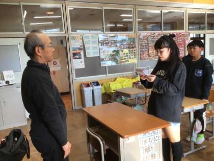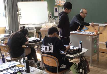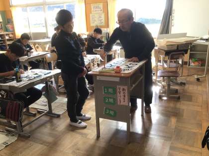 今回は、前回教えていただいた注意点に気を付けて書き初めの練習に取り組みました。書き終わった子から、個別に直しをしていただくだけでなく、「ここが上手になったよ」と、励ましの言葉をいただきました。その言葉で、子どもたちは自信を付けているようでした。授業の最後には、お礼のメッセージカードとともに、感謝の言葉を代表の児童が伝えました。大畑っ子にとって学びの多い時間となりました。