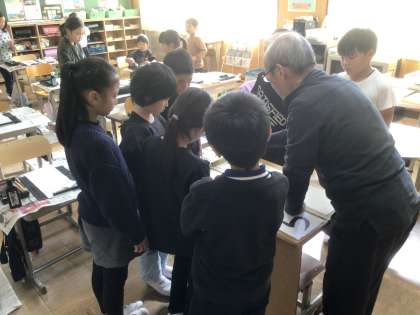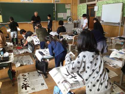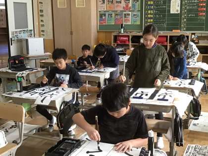 今回も、はじめに示範で、講師の方に実際に書くところを見せていただきました。その後、前回教えていただいた注意点に気を付けて書き初めの練習に取り組みました。書き終わった子から、個別に直しをしていただくだけでなく、「ここが上手だよ」「丁寧に書けたね」などと、励ましの言葉をいただきました。その言葉で、子どもたちは自信を付けているようでした。
