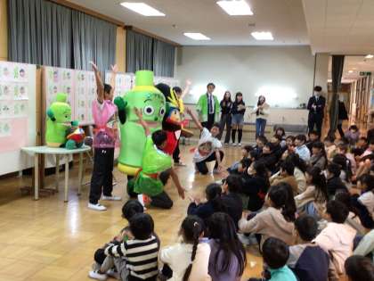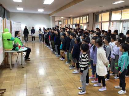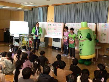 伊藤園から、お茶のプロが来てくださいました。全校で記念セレモニーを行い、お茶について教えていただきました。お茶の種類やお茶の作り方などを聞くと「へえ、そうなんだ」「きゅうす、おばあちゃんちにあります」などとつぶやく子たちもいました。大畑っ子お馴染みのばたっぴぃズに付き添われ、「お〜いお茶くん」と大畑小学校マスコットキャラクター「ばたっぴぃ」も登場し、全校で写真撮影も行いました。また、来てくださった感謝の気持ちを込めて、校歌と「スマイルアゲイン」を歌いました。風邪が流行る時期に、カテキンが含まれるお茶をたくさん飲んで、元気に過ごせるといいですね。