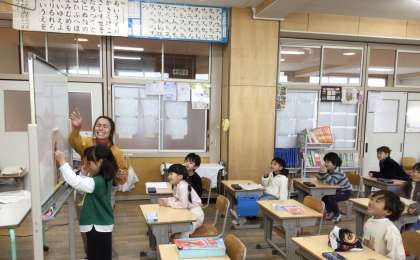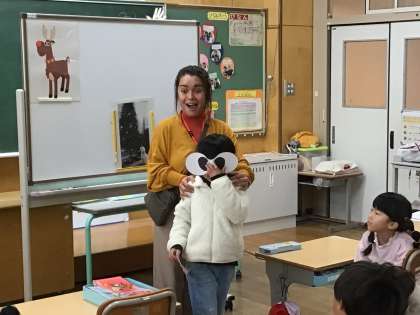 上、下、右、左の言い方を使って、グループで協力して、トナカイに鼻をつけたり、クリスマスツリーに星をのせたりしました。“You can do it.”などと言いながら、応援する子たちもいて、教室はとても盛り上がりました。