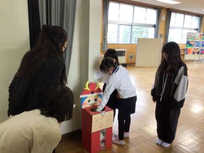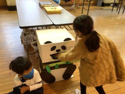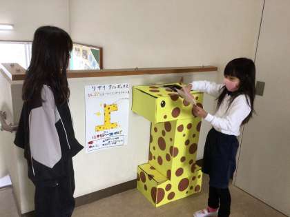 4年生が作ったリサイクルボックスが大畑っ子に大人気です。1年生は、「パンダちゃんにエサをやらないと」と言って、リサイクルできる紙を片手に嬉しそうに、パンダの形をしたリサイクルボックスに向かいます。キリン、ばたっぴぃのリサイクルボックスは2階で大畑っ子に愛されています。ご来校の際には、それぞれのリサイクルボックスにエサをやってご協力いただけるとありがたいです。