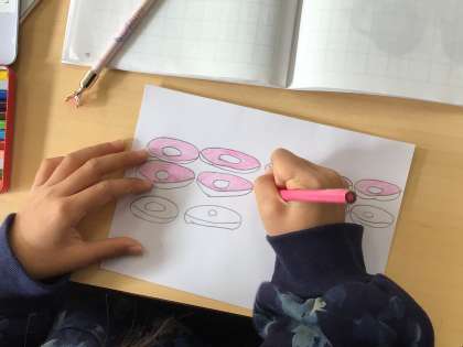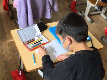 計算の紙芝居を作り始めました。8+6か12-7のどちらかの計算を選んで、お話を作っています。学習用タブレットを使って、自分の好きなキャラクターを調べる子や図書室で借りた本を見ながら絵を描く子などそれぞれが一生懸命取り組んでいました。どんなお話ができるかとても楽しみです。