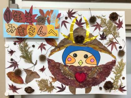 秋見つけを頑張った1年生に、素敵な贈り物が届きました。大畑小学校にある落ち葉や木の実などの自然の宝物を使って、校内の環境整備をしている校務支援員、公務手が作成した大畑小学校マスコットキャラクター「ばたっぴぃ」です。1年生は、できばえのすばらしさに驚き、一瞬声を失って、その後「うわぁ、すごい!ばたっぴぃだ」と大喜びでした。