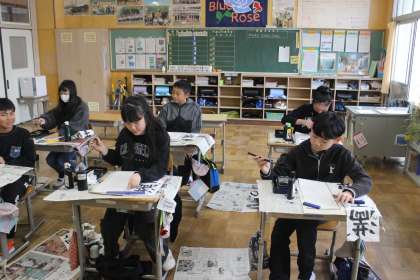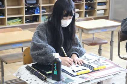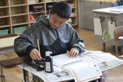 今日は、朝一番の全校集会のあと、書き初め大会が行われました。凛とした空気の中、子どもたちは真剣な表情で取り組んでいました。