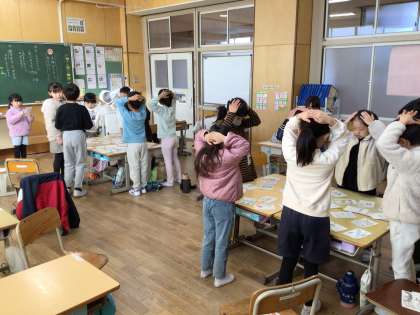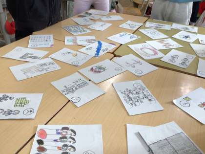 2年生は国語科の授業でかるた作りをして、完成後、クラスで遊びました。かるたは、「大畑かるた」と名付け、読み札は「ねらうぞ優勝、大畑フェスティバル」「ちいきのみんなが優しい、大畑地区」「ひろみ城のかぶと、かっこいい」など、大畑小学校や大畑地区に関するものにしました。そして、絵札も読み札に合った絵を描きました。かるた大会では白熱した勝負が行われました。