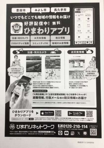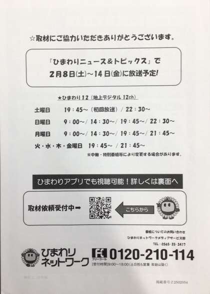 「竹とんぼ贈呈式」と「1、2年生の昔遊び」の様子をひまわりネットワークが取材、撮影していきました。大畑っ子のために活躍していくださった地域の方がメインではありますが、「ひまわりニュース&トピックス」で放送されます。日時は以下の通りです。また、「ひまわりアプリ」でも視聴可能だそうですので、そのチラシも載せました。参考にしてください。
