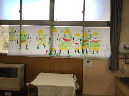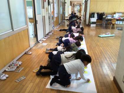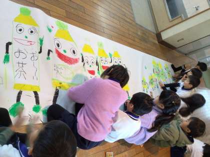 俳句のプロをお迎えするために、「お〜いお茶くん」の絵を描きました。長い紙を前に座って、クレヨン•パスを手に描き進めました。隣同士で手を繋いでいるように描く子、「お〜いお茶くん」がジャンプしているように描く子、キャップの線を丁寧に描く子などなど…