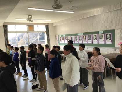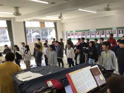 校歌とふるさとの合唱指導をしていただきました。声の出し方や曲の盛り上がりを意識した歌い方を学びました。講師の先生のお話を聞いて、みるみる上達していく4、5年生。高学年らしい、豊かな歌声を響かせました。
