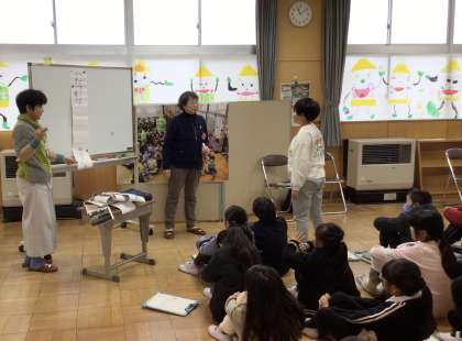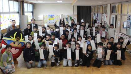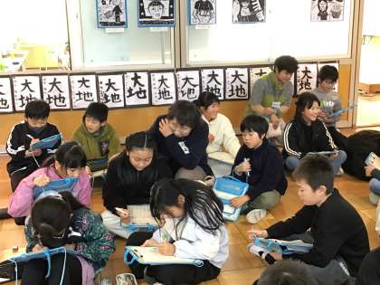 俳句の先生をお呼びして、4、5、6年生は俳句づくりにチャレンジしました。まず、俳句について学び、俳句の種を探すべく「大畑の森」へ行きました。寒い空気を感じたり、落ち葉や空の様子などを見たりして、たくさんメモを書きました。俳句をつくるときには、悩みながらも友達と相談し合ったり、俳句の先生にアドバイスをしていただいたりして、どの子も納得のいく俳句をつくることができました。句会では、先生にたくさん褒めていただき、大喜びの子ども達でした。
