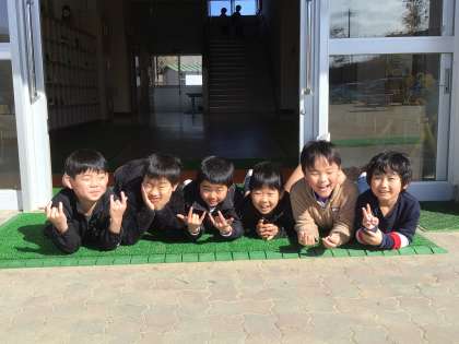 長い休み時間、ぽかぽかの日差しのもと、おうちの方を昇降口で待つ3年生。