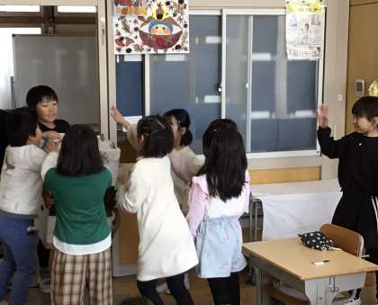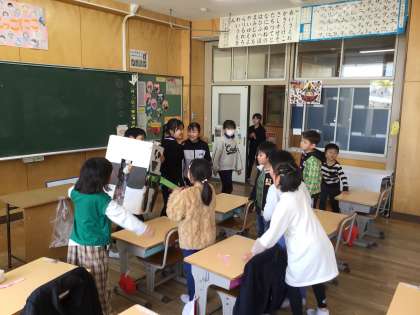 4年生が、総合的な学習で取り組んできた環境学習の一環で制作したパンダちゃんとのお別れの日がやって来ました。4年生は、「パンダちゃんにえさをやることで、紙類をリサイクルすることに協力してくれて、ありがとうございました。これからもぜひ紙を大切に使い、リサイクルもしていってください」と1年生に手作りのしおりを贈りました。1年生の子どもたちは、名残惜しそうに、パンダちゃんに別れを告げていました。