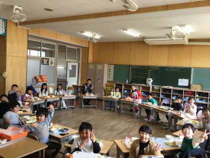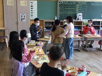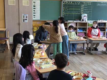 今年度最後の給食に、6年生の担任の先生を誘いました。始めに、6年生にも贈ったシダーローズと大畑小学校マスコットキャラクター「ばたっぴぃ」がついたメダルを感謝を込めてプレゼントしました。大きな円になって、楽しくおしゃべりしながら食べる給食は、普段とまた違い、心に残るものとなりました。