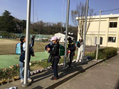 新6年生として、通学班で班の子たちの安全を見守りながら登校し、いつものように旗の掲揚を行いました。各学年の担当教諭が誰なのかが気になりながらも、最高学年としてするべき仕事をまず行う姿勢が感じられました。