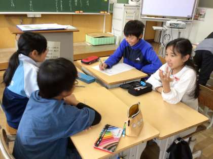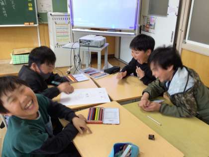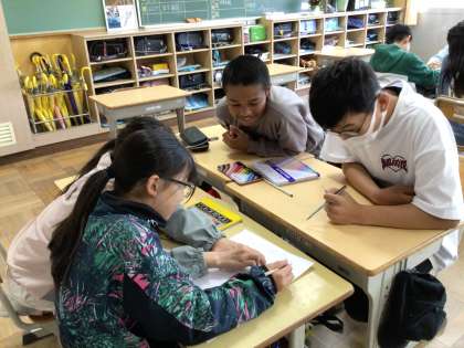 担任の似顔絵描きをしました。グループになり、順番に鼻の穴、鼻、目、眉毛……と描いていきました。「先生、こちらを向いてください」「メガネの形、難しいな」などと言いながら、みんなで楽しそうに描き進めました。クラス中が笑顔いっぱいで、楽しい時間となりました。授業参観のときには、教室に掲示されていますので、ぜひご覧ください。